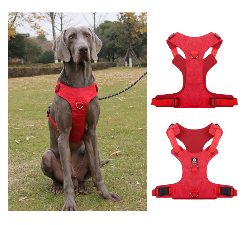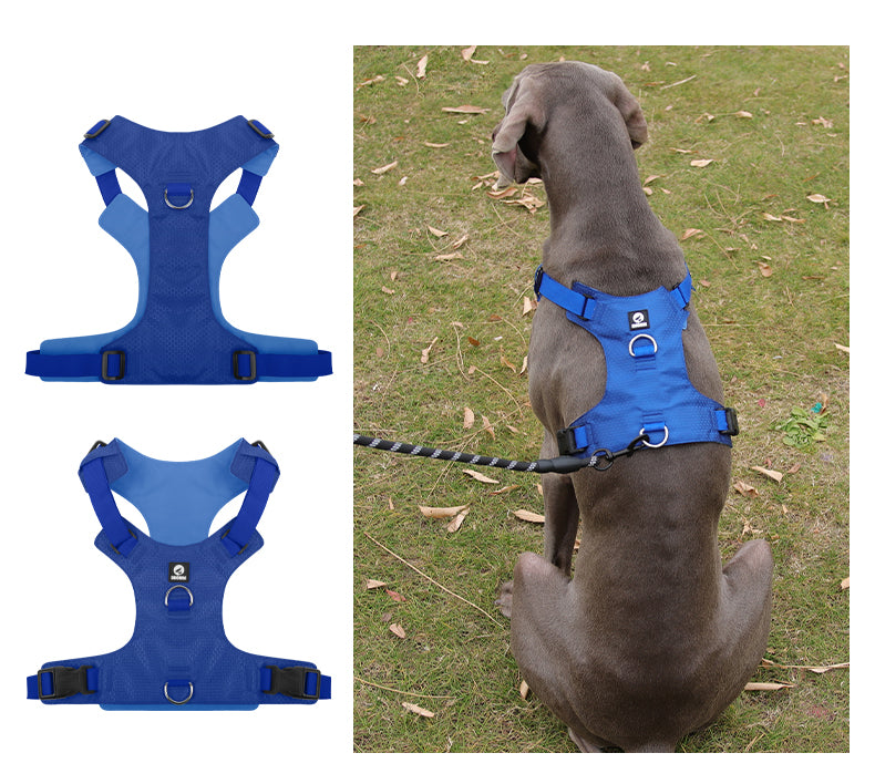 Introducing a heavy-duty dog harness designed for maximum control and comfort during walks with energetic dogs. This no-pull harness features multiple secure D-ring attachment points, giving you flexibility in leash positioning while maintaining control. Crafted from durable oxford material, the harness combines strength with comfort for your canine companion. The thoughtfully engineered design includes convenient quick-release buckles and fully adjustable straps to ensure a perfect, escape-proof fit for your dog. The harness's structure distributes pressure evenly across the chest rather than the neck, preventing choking or strain during walks. Available in black, this harness showcases a sleek hexagonal pattern texture that's both stylish and functional. Whether for daily walks or training sessions, this harness provides the security and durability needed for active dogs while ensuring their comfort. The strategic placement of D-rings allows for both front and back leash attachments, giving you versatility in handling methods based on your dog's walking style and training needs.